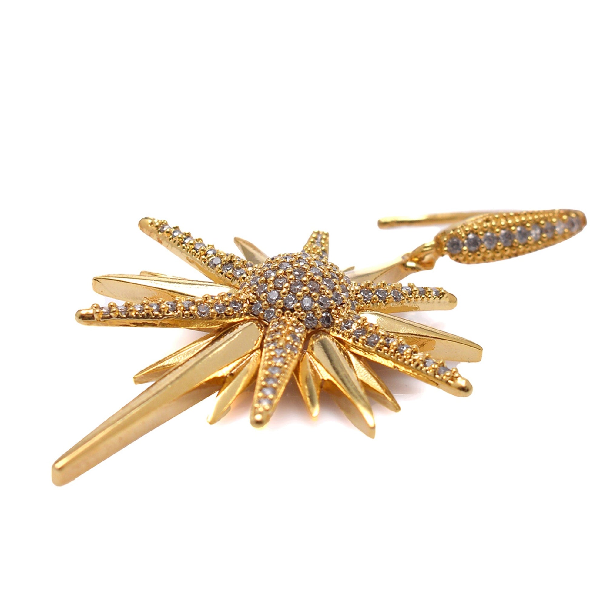 Inspired by the guiding light of the North Star, the Golden Pole Star Earrings pay homage to the symbol of safe travel and direction. These exquisite earrings are crafted from 22K gold-plated high-quality brass and adorned with diamond-mounted high-quality zircon stones for a dazzling finish. Designed with a secure pin closure and weighing 12g, they offer both comfort and sophistication, making them the perfect statement piece for any occasion.
